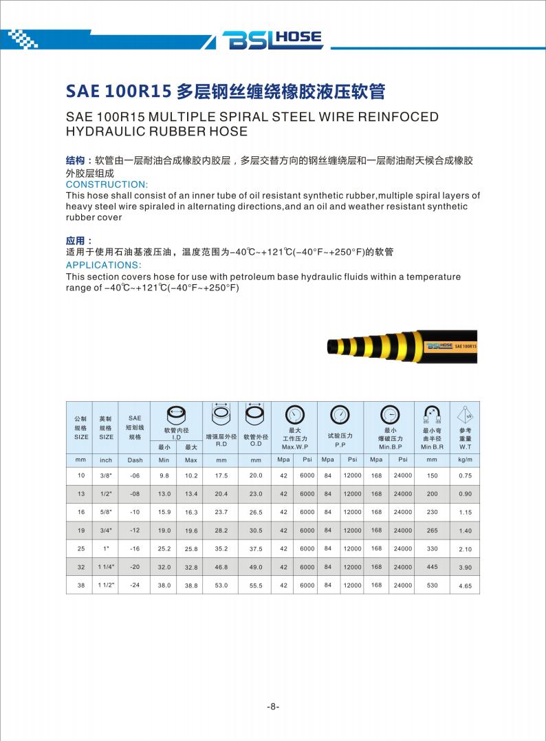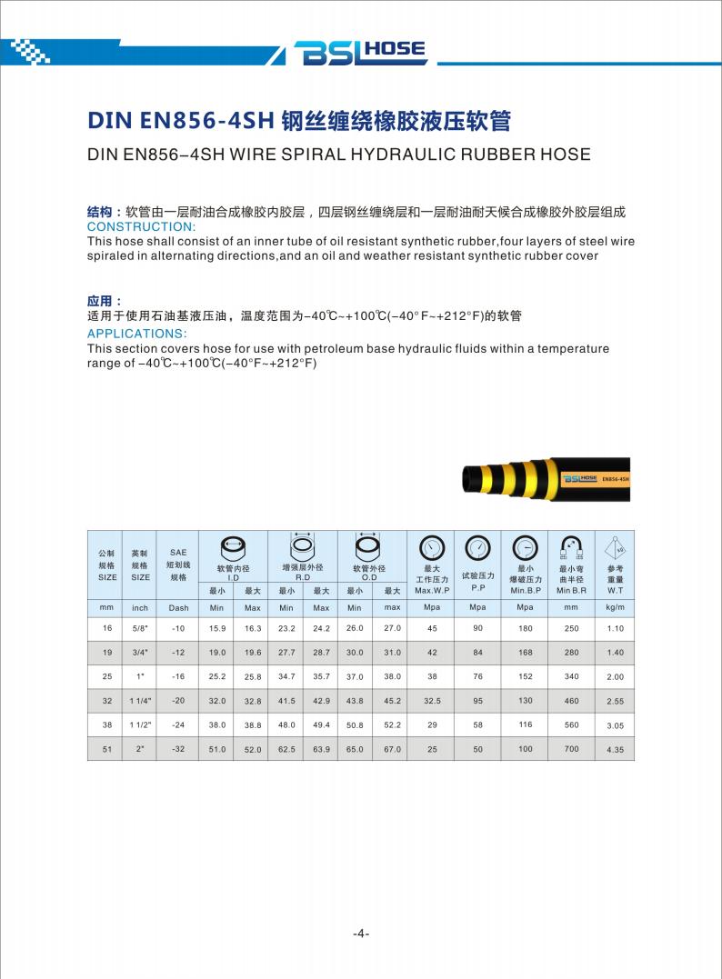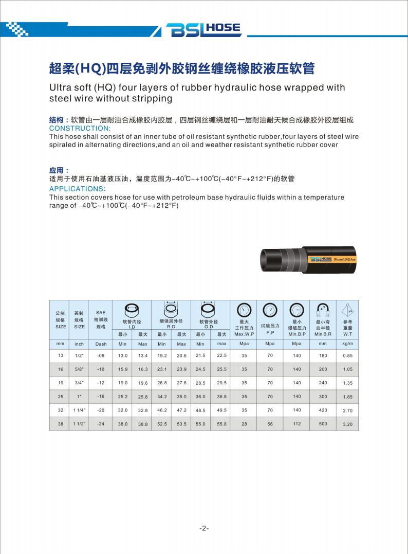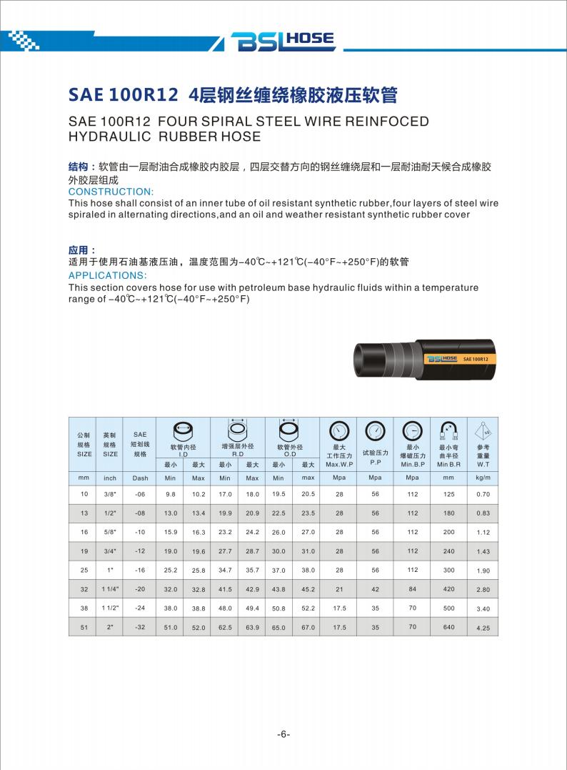 钢丝缠绕软管:该软管由一层耐油合成内胶,四层或六层钢丝缠绕层,一层耐油耐天候橡胶组成,产品类别有EN856 4SP、4SH, SAE R12, SAE R13, SAE R15以及ISO18752 CC、DC.脉冲次数超过100万次。耐温121℃,外观光面或毛面。