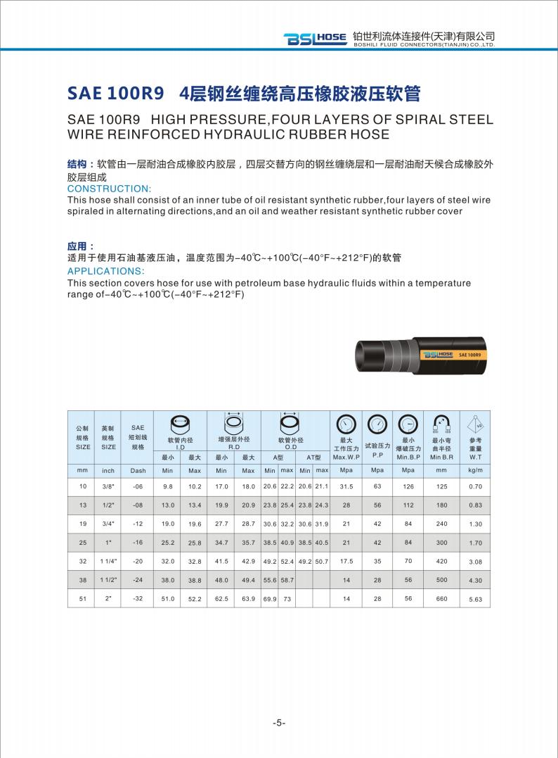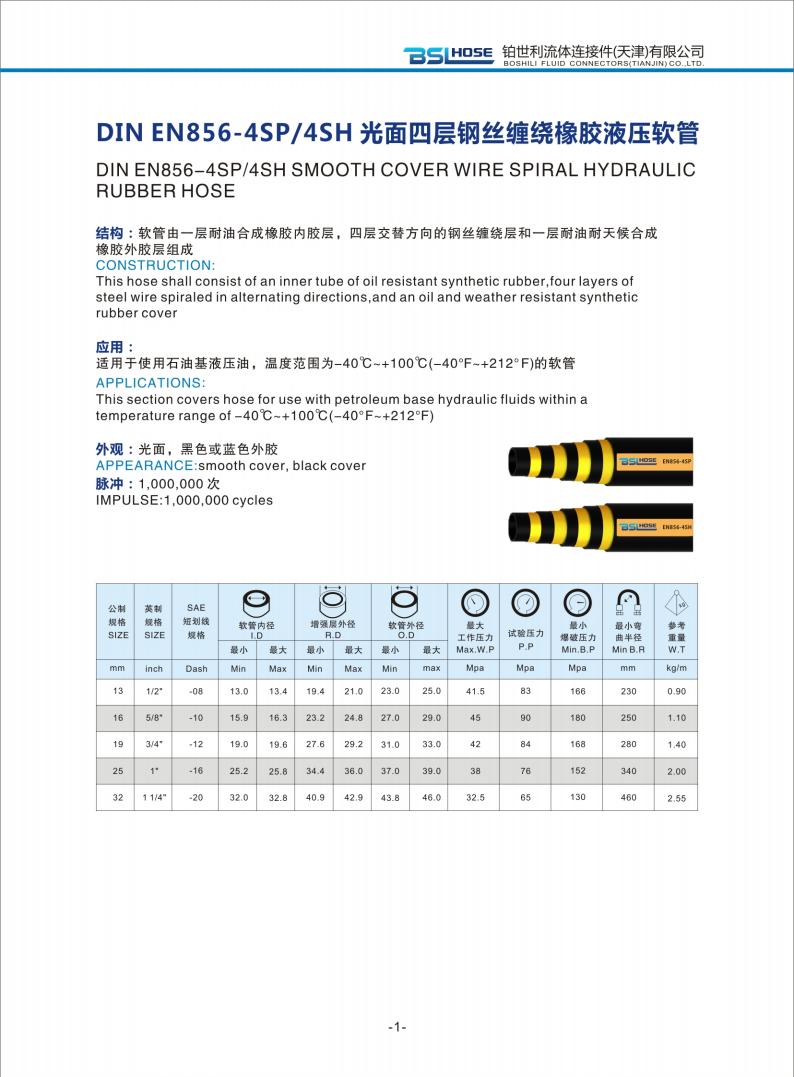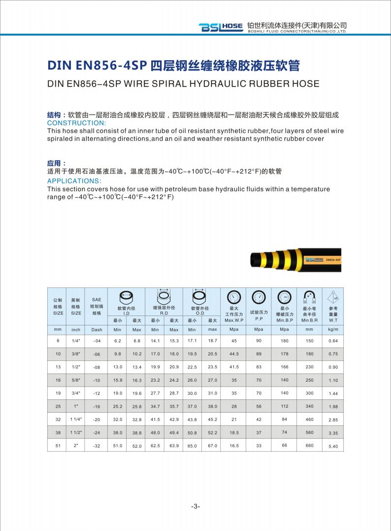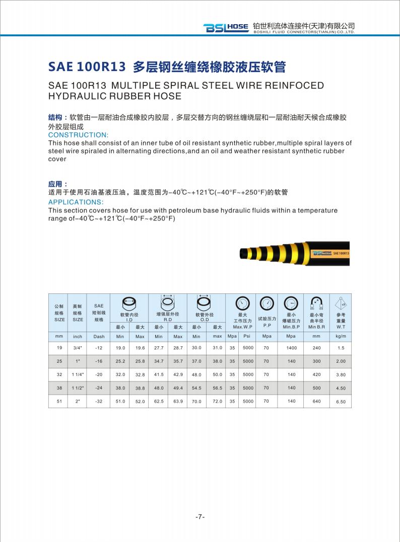 钢丝缠绕软管:该软管由一层耐油合成内胶,四层或六层钢丝缠绕层,一层耐油耐天候橡胶组成,产品类别有EN856 4SP、4SH, SAE R12, SAE R13, SAE R15以及ISO18752 CC、DC.脉冲次数超过100万次。耐温121℃,外观光面或毛面。