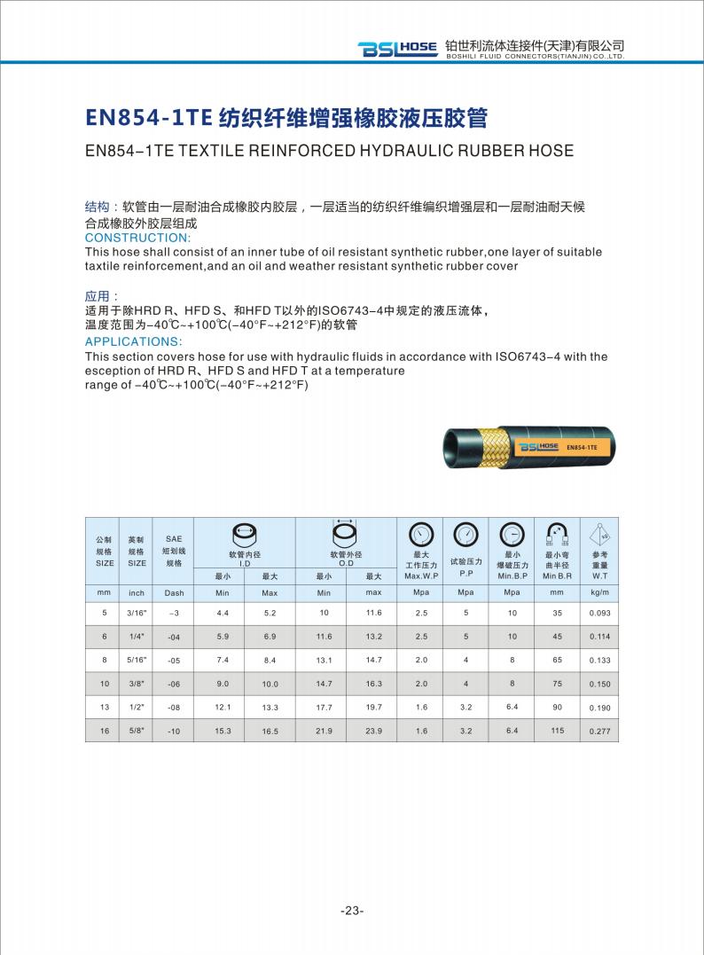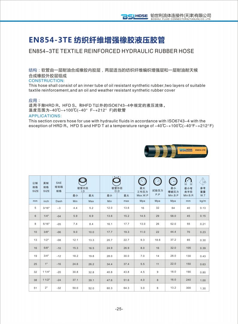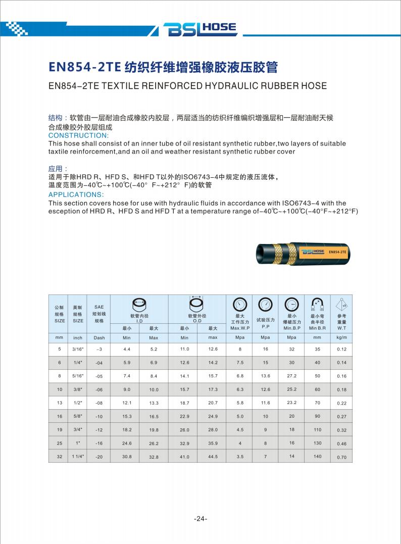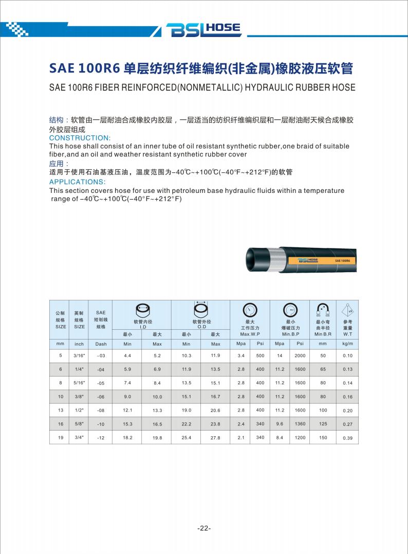 纤维软管:该软管由一层耐油合成内胶,一层或二层纤维编织层,一层耐油耐天候橡胶组成,产品有EN854系列1TE、2TE、3TE、R6以及SAE系列R3、R6等。外观为光面和毛面